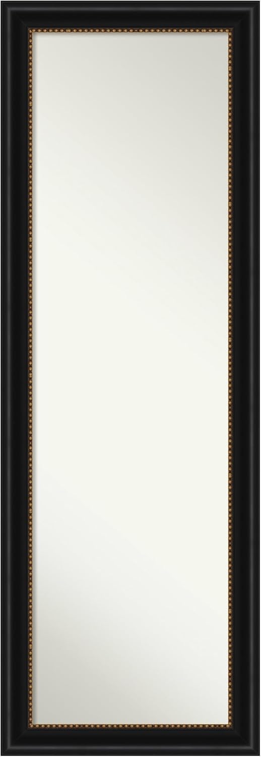 PRODUCT: Amanti Art Non-Beveled Door Mirror; FRAME: Thomas Black Bronze; FRAME FINISH: Bronze; FRAME COLOR: Black; OUTER SIZE: Exactly 19.75 x 53.75 inches. The Thomas Black Bronze frame is a black scooped frame with decorative champagne inner and outer edges. This high-quality, full-length mirror complements your decor without the need for unsightly over-the-door brackets. Individually made using traditional custom framing techniques, it has the quality you would expect from your local frame shop. It holds its value with premium finishing that can be appreciated up close. Our On The Door Mirror has two hooks to hang directly on your door or wall without additional anchors or brackets. Hang it on the back of a closet, bedroom or bathroom door, or wall as a standard full-length mirror. Because of our attention to detail and focus on artistry, architects, interior designers, and homeowners alike choose this mirror to create beautiful living spaces.