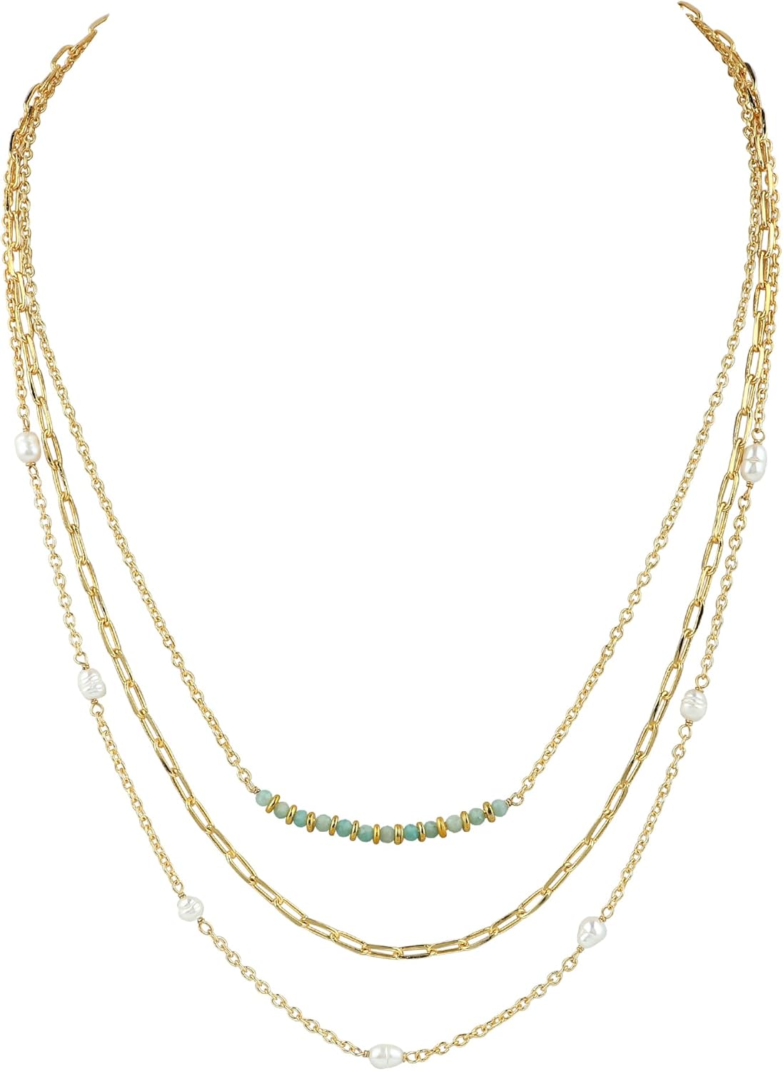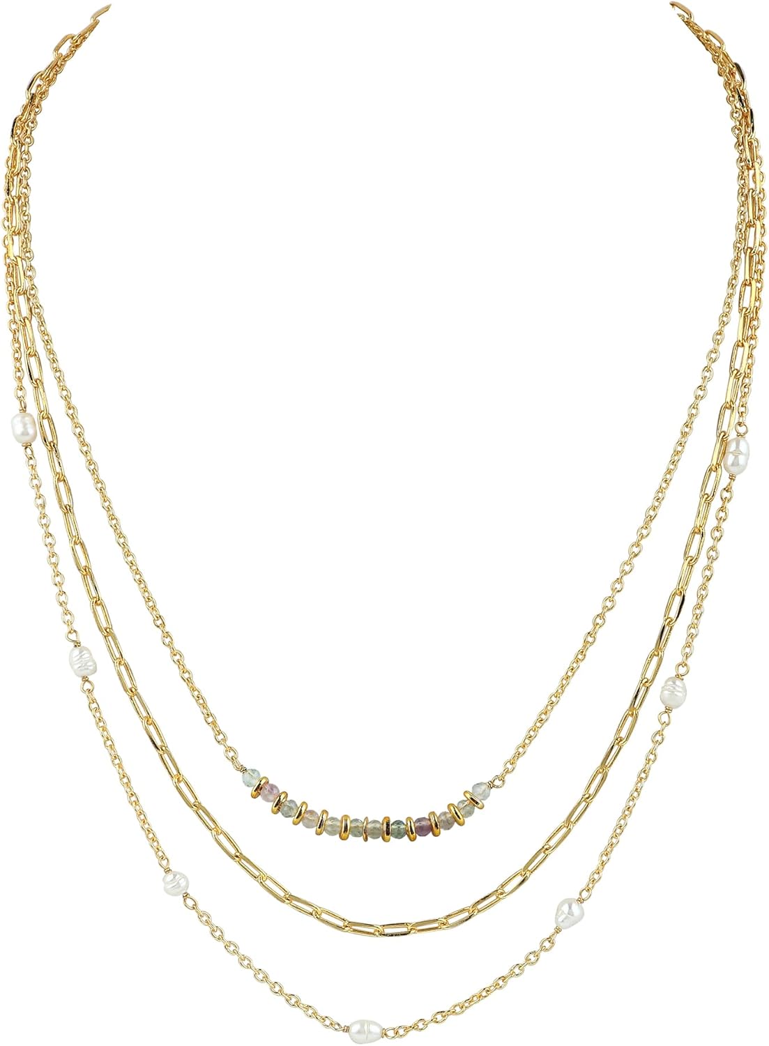 Elevate your style with this exquisite three-layer choker necklace that combines the timeless beauty of gemstone beads with lustrous pearls. The sophisticated design features a harmonious blend of herringbone and paperclip chain patterns crafted from gold-plated brass, creating a stunning Cuban link effect. This versatile piece measures 16 inches with a 2-inch extender chain, allowing for perfect positioning on your neckline. Each layer adds depth and dimension to your look, making it an ideal accessory for both casual outings and special occasions. The combination of mixed metals and gemstones creates a contemporary yet classic appeal that complements any outfit. The secure clasp ensures comfortable wear, while the layered design adds a touch of modern sophistication to your jewelry collection.