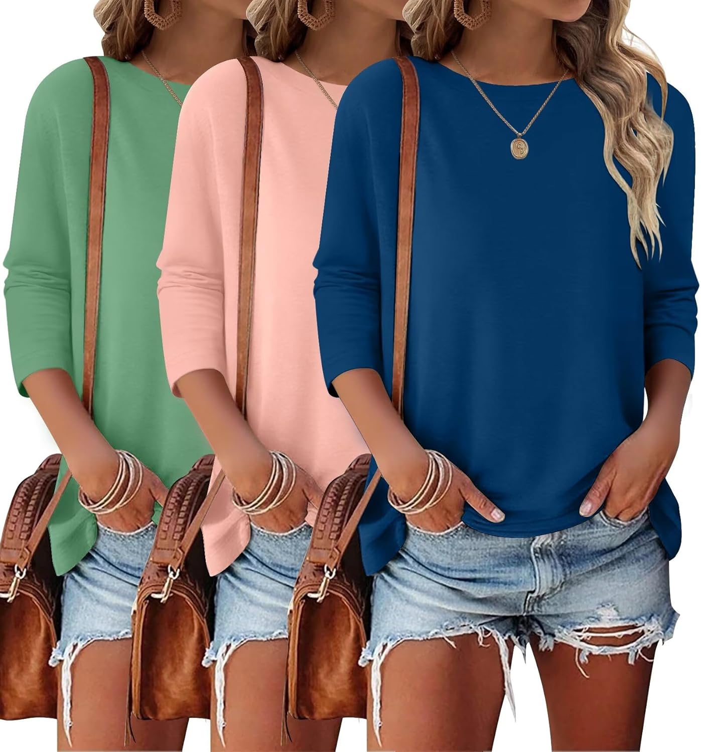 Women's Summer 3/4 Sleeve Tops – 3 Pack Versatile Breathable Essential Set Refresh your warm-weather wardrobe with this value-packed 3-piece set of casual blouses. Designed for comfort and style, each top is made from soft, lightweight fabric with a classic crew neck and relaxed fit—perfect for creating multiple effortless looks all season long. Why You'll Love This Set: Soft Breathable Fabric: Lightweight, stretchy material ensures all-day comfort and keeps you cool. Flattering 3/4 Sleeve Design: Provides versatile coverage—ideal for layering, transitioning indoors to outdoors, and offering a polished alternative to sleeveless styles. Classic Crew Neck Relaxed Fit: Offers timeless style and easy, everyday wearability. Effortless Styling Versatility:Mix and match colors to go seamlessly from business casual office wear to beach vacation outfits, dressy casual dinners, and fashion trendy weekend looks. Perfect For: Daily spring and summer wear, travel, casual outings, brunches, outdoor walks, and layered office attire. Pairs beautifully with jeans, trousers, skirts, shorts, or under blazers. Your 2026 Wardrobe Upgrade: This 3-pack offers unbeatable value and variety, making it easy to build cohesive, season-ready outfits. Designed as a modern staple, it balances comfort, coverage, and breathability for all your warm-weather moments.
