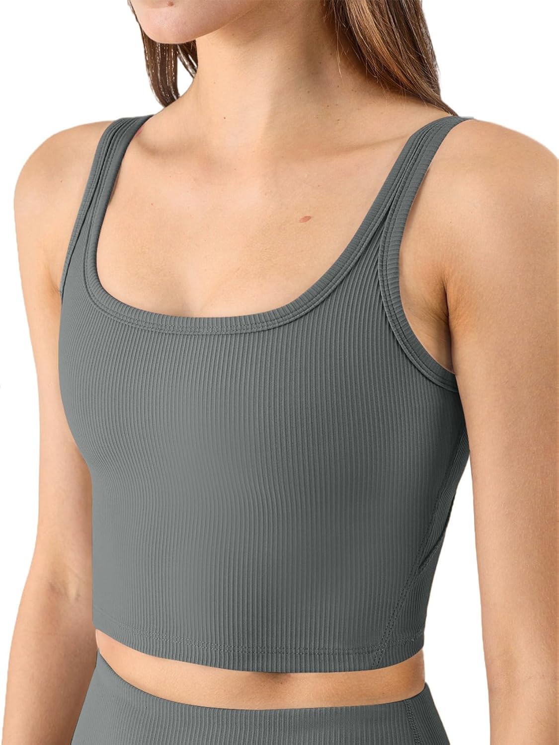 FULL SUPPORT AND REMOVEBLE PADS: The ribbed sports bra is soft and stretch effortlessly with movements, which uses moisture wicking light-weight sponge pad cup with strong resilience and hidden small opening on both sides, easy to remove, adjust and clean. The colors of the pad, built-in bra, and outer crop tops are the same to avoid visual embarrassment