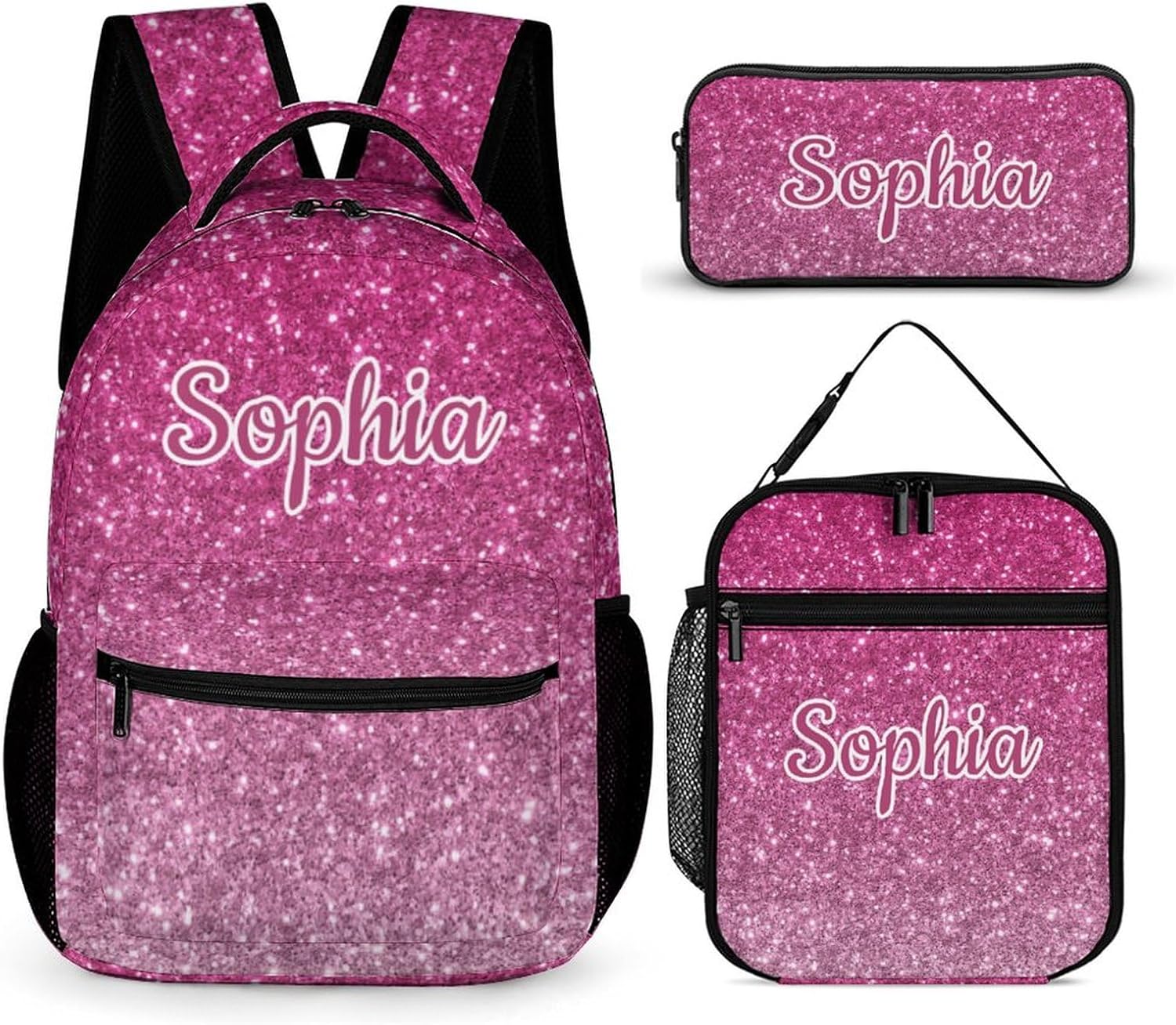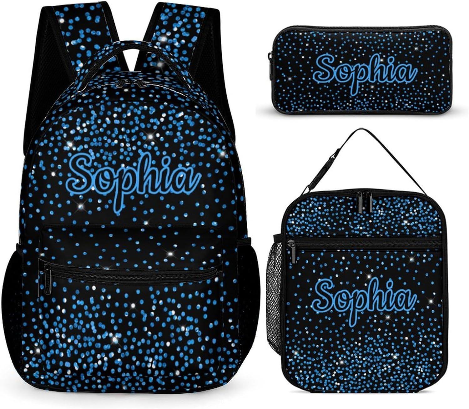 Welcome to our store to buy your Children's backpack three piece set.Dimensions:School Bag(Size:12.6" L x 16.2" H x 5.9" D,Lunch Bag(Size:7.9" L x 4.3" W x 10.8" H ) and Pencil Case(Size:8.7" L x 4.7" H x 2" D)Material:Made of Twill + polyester.Usage:Suitable for any occasion,such as school,park.travel,sports,camping.Warning:over 3 years old.