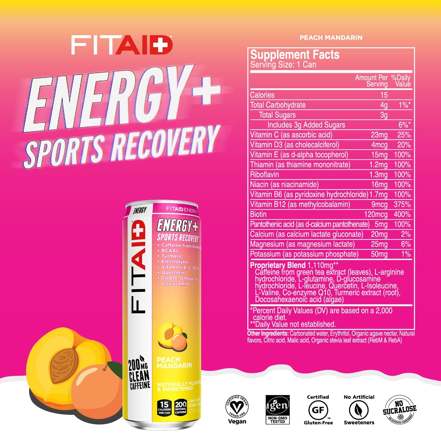 FITAID Energy is the High Caffeine (200mg) version of the #1 Selling Post Workout Drink FITAID. Ideal for HIIT, Weight Training, Pilates, Yoga, or after intense sports like Football, Basketball, Soccer, Baseball, Lacrosse, Swimming, Softball, Wrestling, Hockey, e-Gaming. Get more explosive in your workouts and movements with a bang! Can be taken pre-workout, during and post-workout. As well as Long Drives, Studying, Getting Energized at Work, College Students, Tired Parents. Comes in Variety Mix of all Flavors as well as 24 Bulk Value Packs. FITAID ENERGY is BPA Free. 3g of Net Carbs. Why do we pick these specific ingredients? BCAAs, Glutamine Amino Acids are the building blocks of protein and are essential to the repair of muscles and ligaments. Arginine and Glutamine help develop and maintain two types of strength: power (for max effort lifts) and speed (for Olympic lifts). BCAAs (branched-chain amino acids) reduce protein and muscle breakdown during intense exercise. Omega 3s, CoQ10. Glucosamine, Quercetin, Turmeric The mechanics of high-intensity fitness training can lead to issues with joint and muscle, thus causing unnecessary pain and stiffness. Glucosamine is widely used for its benefit to maintain healthy joints, while Turmeric and Quercetin can help reduce that common post-workout soreness. You’ll be ready to hit the box again right away. B-Complex, Green Tea. A demanding WOD requires stamina and endurance along with bursts of intense power and speed. B vitamins provide the reliable, consistent energy your body demands during an intense workout, and the mild dose of caffeine provided by our Green Tea Extract supplies the boost needed for quick movements. Vitamins C, D, E Powering through an exhaustive workout creates tremendous stress on the body. Calcium, Magnesium, Potassium - Electrolytes regulate nerve and muscle function, the body’s hydration and help the rebuilding of damaged tissue — without the sodium. Best served chilled at 40 Degrees Fahrenheit or 4 Degrees Celsius. Vegan. Supplement your lifestyle.
