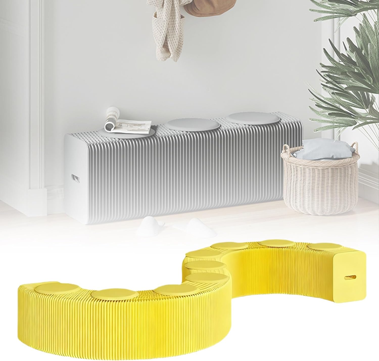 Product Name: Accordion ChairMaterial: High-strength kraft paperColours: Grey / Orange / Blue / Yellow / PinkWeight Capacity: Maximum of approx. 200 kg per personProduct Structure: Honeycomb structureAssembly Method: No tools required; ready to use immediately after unpackingProduct Features: Extendable, foldable, portable, multi-functional designUsage Scenarios: Living room / Dining room / Entrance hall / Study / Café / Trade shows / Rest areas, etc.Product Dimensions:120–150 cm (for 3 people)200–300 cm (for 6 people)500–600 cm (for 9 people)Package Contents:Stool × 1120–150 cm (includes 3 cushions)200–300 cm (includes 6 cushions)500–600 cm (includes 9 cushions)