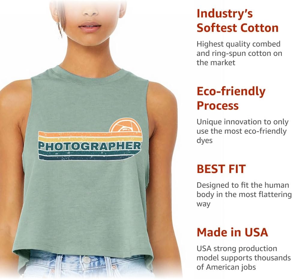 Cute and flattering Photographer Print Racerback Cropped Tank is suitable for most indoor or outdoor activities, such as gym, yoga, running, hiking, beach or relaxing around the house. Pair Art Print Women's Tank with your favorite sports bras, especially strappy ones, and high-waisted leggings, then you will enjoy cool and comfortable exercise throughout the summer.