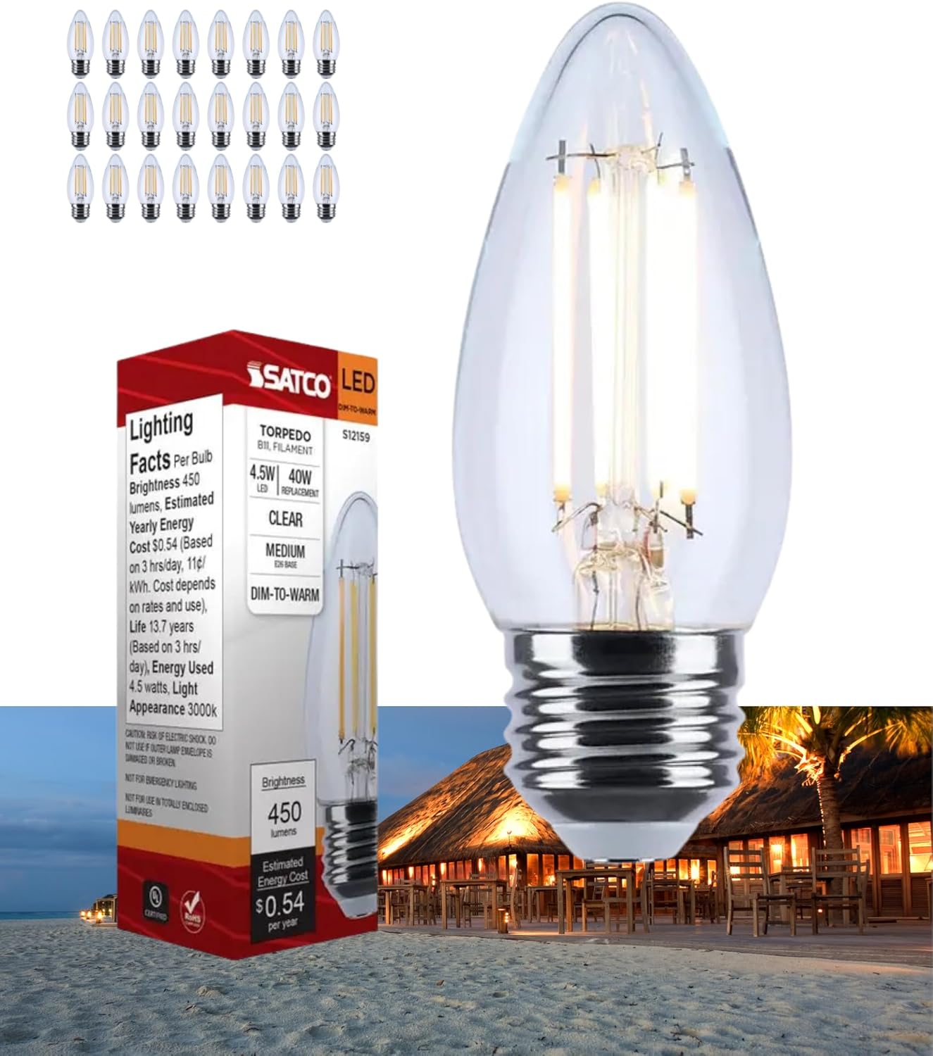 The Satco S12159 is a 4.5 watt LED B11 candle with an E26 medium base that brings warm dimming comfort to fixtures that do not use a candelabra socket. At full output it produces about 450 lumens at 3000K, and as you dim, the color smoothly warms toward 2000K for candlelike ambience in dining rooms, bedrooms, foyers, and hospitality spaces. A 90 CRI light engine keeps colors natural, while a wide 300 degree distribution fills shades and glass arms evenly. Designed as a practical 40W incandescent replacement, S12159 installs into standard medium base sockets for quick retrofits in chandeliers with E26 sleeves, wall sconces, pendants, and ceiling fans. The clear glass envelope preserves the sparkling look people expect in visible fixtures. Rated for enclosed fixtures, it handles lanterns and glass bowls where heat can shorten life in ordinary lamps. This lamp supports warm dimming and includes built in 0.5 kV surge protection. Power factor is 0.7 for typical residential circuits, and the driver is tuned for smooth, consistent output across the range. It is Title 20 listed, cULus safety listed, FCC compliant, and RoHS conformant. Rated life is 15,000 hours and the product is backed by a 3 year warranty for dependable daily use.
