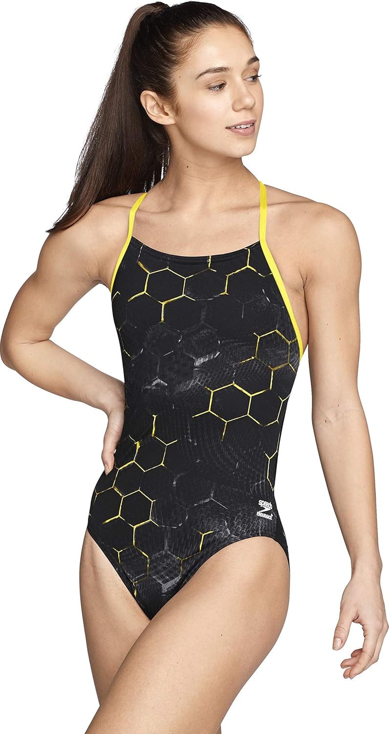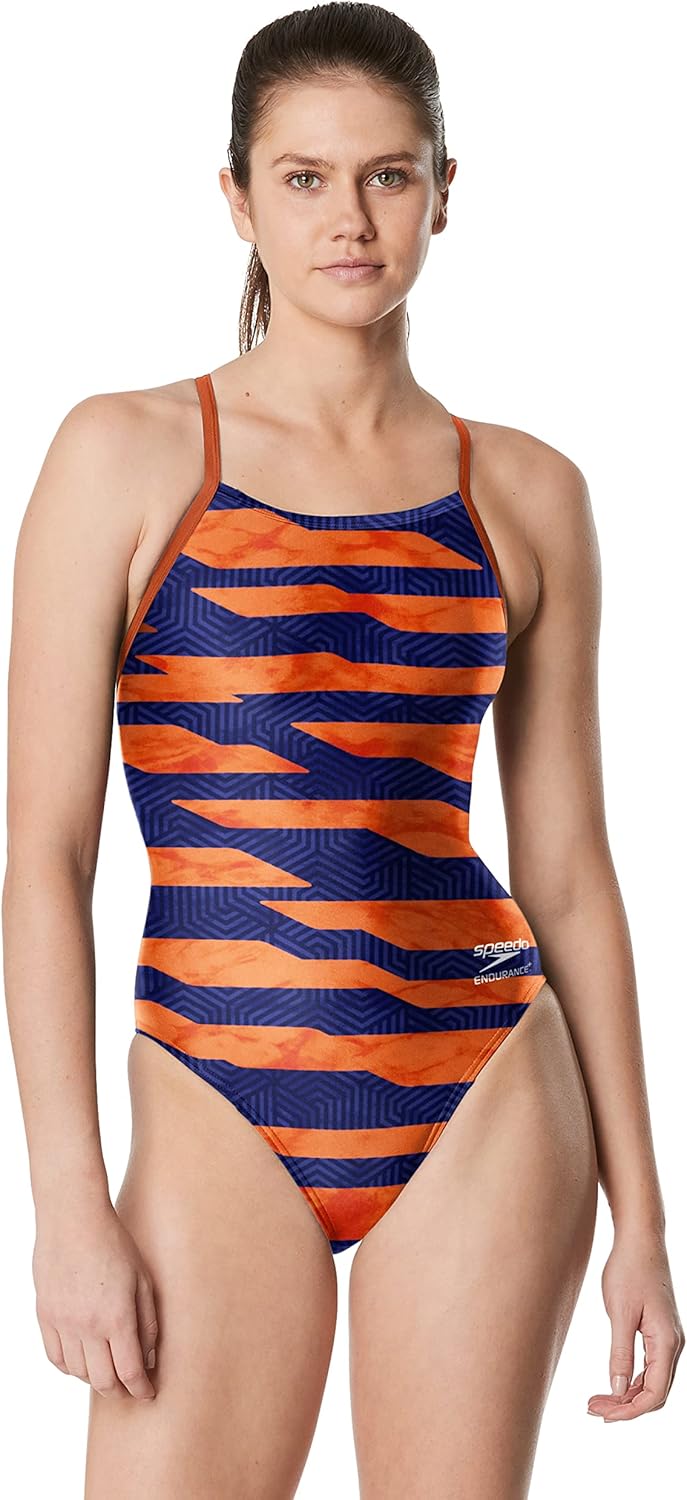 On the pulse. Stay the course on race day in a swimsuit engineered for performance. Made from chlorine-resistant Endurance+ fabric, this printed style is durable enough to last through the season and beyond. A crossback design encourages greater range of motion and comfort with every stroke.