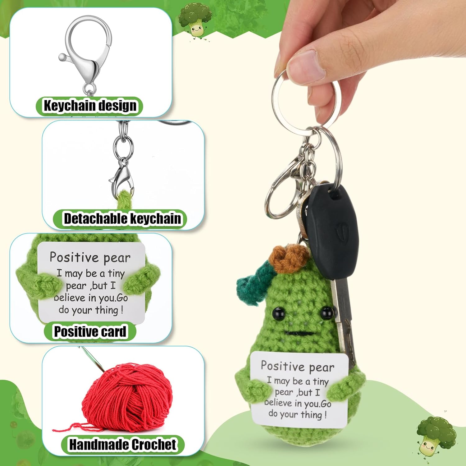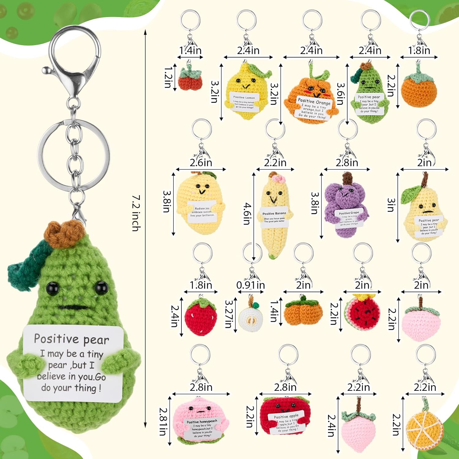 Features: Encouraging Decorations: Life isn't always smooth sailing, and these adorable crocheted dolls and warm words will make someone smile and feel encouraged to overcome difficulties. Creative Crochet: Each cute knitted keychain is carefully woven. The texture is soft and comfortable, with excellent elasticity, and you can relieve pressure by squeezing it. Specifications: Material: knitted Color: multicolor Package includes: 18 x Motivation crochet Dolls Notes: Manual measurement, please allow slight errors on size. The color may exist a slight difference due to different screen displays. Recommended age for this product: 14+