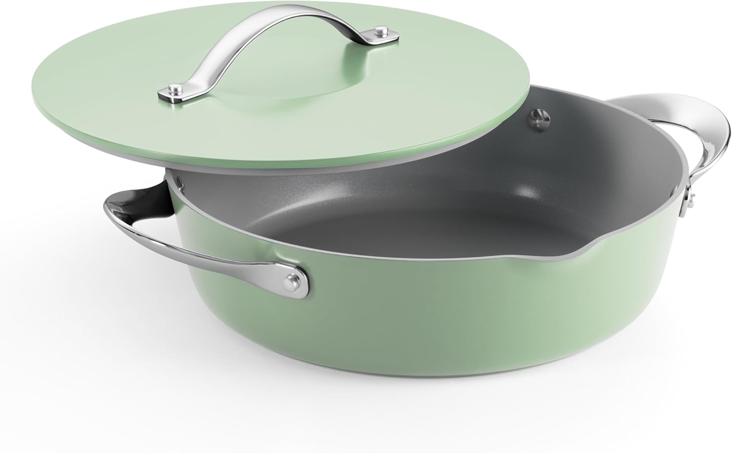 Discover the perfect blend of functionality and elegance. Designed for home cooks who value reliability and convenience, this pan is your go-to tool for creating delicious meals with ease. Imagine a pan that not only meets but exceeds your cooking needs. Whether you're sautéing vegetables, searing meats, stir-frying noodles, braising stews, simmering sauces, or slow-roasting your favorite dishes, the Fiora pan handles it all effortlessly. Its heavy-gauge aluminum construction ensures even heat distribution, eliminating hot spots and ensuring perfectly cooked meals every time. The ILAG® Swiss Crystal ceramic non-stick interior makes cleanup a breeze. No more scrubbing or soaking—just a quick rinse, and it's ready for your next culinary adventure. The aluminum alloy lid, featuring self-basting condensation ridges, locks in moisture and flavor, enhancing the taste and tenderness of your dishes. Heavy-duty riveted handles provide a comfortable and secure grip, making it easy to transfer from stovetop to oven, where it’s safe up to 400°F (205°C). Compatible with all cooktops, including induction, gas, electric, and ceramic glass, this pan is as versatile as it is durable.